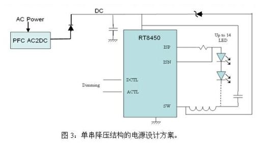 該方案的優(yōu)點(diǎn)是降壓結(jié)構(gòu)效率較高、單串設(shè)計(jì)、配置較為靈活,缺點(diǎn)是電路成本較高、LED串聯(lián)數(shù)目受限于IC耐壓。它適合通過(guò)適配器輸入的路燈