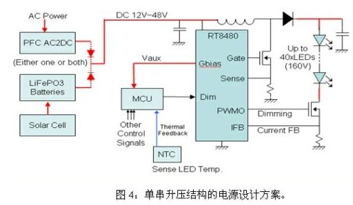 該方案的優(yōu)點(diǎn)是串聯(lián)LED數(shù)目不受IC耐壓限制,缺點(diǎn)是電路成本較高,效率較降壓結(jié)構(gòu)稍低。它適合太陽(yáng)能路燈。