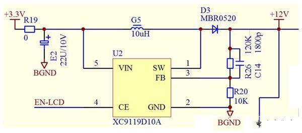 這個芯片把三極管集成到芯片內部,因此應用比較簡單。因為它能提供的電流很小,是給lcd供電的。+12V后面還有一個10uF/25V的電容。