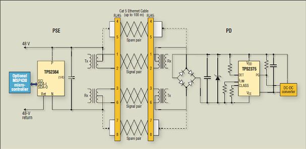 圖1、在本單端口 PoE 應(yīng)用例子中,通過(guò)以太網(wǎng)線纜的信號(hào)對(duì)實(shí)現(xiàn)了電源供電;而通過(guò)備用雙絞線對(duì)實(shí)現(xiàn)了更多電力供應(yīng)。