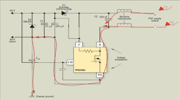 在PoE 應(yīng)用中,PSE 是由 48-V 電源供電的。通常,PSE 會(huì)有一些與大地接地相連的共模電容。這些電容可以是離散電容,也可以是 PCB 板的層間電容,或兩類電容的結(jié)合。由于 PSE 實(shí)際上并不是浮動(dòng)的,因此施加于數(shù)據(jù)連接器上的任何共模電壓瞬態(tài)都能造成 PSE 組件的電壓擊穿。對(duì)于 PSE 端口電源開關(guān)晶體管來(lái)說(shuō),尤其如此。圖 2 顯示了該效應(yīng),并顯示了在沒(méi)有保護(hù)電路時(shí),造成對(duì) PSE 電源開關(guān)晶體管損壞的大電流路徑。CCM 表示系統(tǒng)的 48-V 線路與外殼接地之間的共模電容。這可以是 48-V 電源的正或負(fù)(48-V回路)線路。為簡(jiǎn)化原理圖,僅在負(fù)極線路顯示了 CCM。該配置適用于使用 AC 斷接電路時(shí)的應(yīng)用,該配置還要求使用 D1。AC 斷接電路的工作會(huì)導(dǎo)致瞬態(tài)保護(hù)出現(xiàn)最壞的情況。