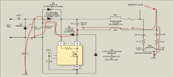 圖 5、本圖闡明了鐵氧體磁珠和鉗位二極管將正極ESD/EFT事件從 TPS2384 芯片的 N 終端轉(zhuǎn)移到底座接地的電流路徑。