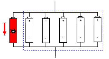 對(duì)于并聯(lián)的鋰離子動(dòng)力電池模組,當(dāng)其中一節(jié)或幾節(jié)電池發(fā)生內(nèi)短時(shí),電池模組中的其他電池會(huì)對(duì)其放電,電池組的能量會(huì)使內(nèi)短電池溫度急速升高,極易誘發(fā)熱失控,最終導(dǎo)致電池起火爆炸。如示意圖1所示