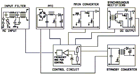 控制電路。半導(dǎo)體制造商最近以來一直在開發(fā)用于電源的集成化控制電路。這樣可以減少組件數(shù)量、降低制造成本并節(jié)省板空間,哪怕集成電路可能本身比離散組件更為昂貴。比如IR1150-這是一種PFC芯片,作為單循環(huán)控制(OCC)設(shè)備使用,可以在保持電源系統(tǒng)性能的同時大大減少元組件數(shù)量。同樣,可以通過特殊應(yīng)用芯片來進(jìn)行主轉(zhuǎn)換器電壓控制、過電流保護(hù)、過電壓保護(hù)和過溫度保護(hù),并控制輸出整流器轉(zhuǎn)換。另外,還可以通過同步單啟動分源、借助邏輯控制來關(guān)閉電源的抑制電路、“電源狀態(tài)良好”信號、備用轉(zhuǎn)換器控制功能等控制渠道來提高應(yīng)用的靈活性。當(dāng)交流電源存在時,備用轉(zhuǎn)換器可以單獨(dú)提供5V的輸出。