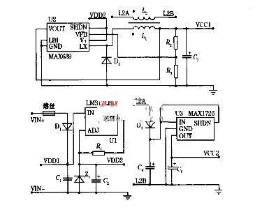 LM317L是三端可調(diào)穩(wěn)壓器,圖2是它的典型應(yīng)用。圖2(a)是它作為標(biāo)準(zhǔn)穩(wěn)壓器時的基本應(yīng)用,此時在它的輸出端與調(diào)整端之間固定產(chǎn)生一個穩(wěn)定的壓差,典型值為1125V,因此,它的輸出電壓VO=1125(1+Ra/Rb)。利用LM317的輸出端于調(diào)整端之間具有穩(wěn)定壓差的特性,它也經(jīng)常被用來設(shè)計恒流源,圖2(b)是典型應(yīng)用電路,它產(chǎn)生的電流大小為I=1125/R.參見圖1,設(shè)計中R1取值為360Ω,故可以獲得約315mA的恒流?紤]到后續(xù)的DC/DC芯片的工作電壓范圍為4~11V,同時考慮到實際電源的輸出功率大小,使用了1個812V的穩(wěn)壓管Z1完成并聯(lián)穩(wěn)壓功能,同時為U2提供穩(wěn)定的入口電壓,條件是U2總消耗電流小于314mA,Z1必須選擇在小于011mA擊穿電流時即可穩(wěn)定的優(yōu)質(zhì)穩(wěn)壓管(可選用Philips公司的產(chǎn)品,最低靜態(tài)穩(wěn)定電流僅幾十μA)。