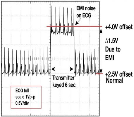圖 1 1.5 英尺以外的發(fā)射器(f = 470 MHz, P= 0.5W)開啟和關(guān)閉時 ECG 診斷設(shè)備的心臟檢查結(jié)果
