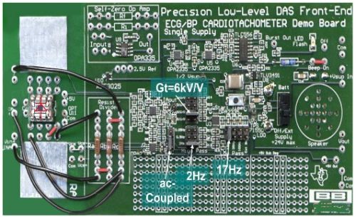 圖 1 中,系統(tǒng)的心臟輸入信號約為 0.25 mVp-p。這種小信號要求有 6000 V/V 左右的測量放大器增益。幸運的是,圖 1 所示情況并不代表醫(yī)用 ECG 測量設(shè)備的實際性能。這種測量實際是使用圖 2 所示電路板在工程師的實驗室中進行的。