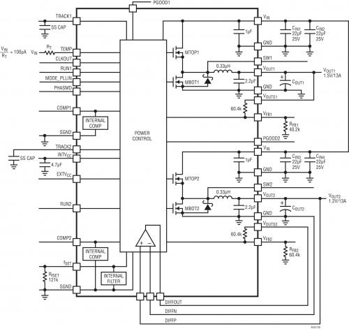 圖 2 顯示了 LTM4620 µModule 穩(wěn)壓器的方框圖。LTM4620 由兩個(gè)高性能同步降壓型穩(wěn)壓器組成。輸入電壓范圍為 4.5V 至 16V,輸出電壓范圍為 0.6V 至 2.5V,而 LTM4620A 的輸出電壓范圍為 0.6V 至 5.5V。LTM4620 的電氣特性為 ±1.5% 的總輸出準(zhǔn)確度、經(jīng)過(guò)全面測(cè)試的準(zhǔn)確均流、快速瞬態(tài)響應(yīng)、具備自定時(shí)和可編程相移的多相并聯(lián)工作、頻率同步以及準(zhǔn)確的遠(yuǎn)端采樣放大器。