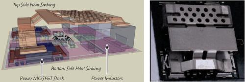 圖 3 顯示了一個(gè)尚未模制的 LTM4620 之染色側(cè)視圖和頂視圖。封裝設(shè)計(jì)由熱傳導(dǎo)性很高的 BT 襯底和足夠的銅箔層組成,以提高電流承載能力并實(shí)現(xiàn)至系統(tǒng)電路板的低熱阻。一種專有引線框架功率 MOSFET 棧用來(lái)提供高功率密度、低互連電阻、以及給器件的頂部和底部提供很高的熱傳導(dǎo)性。專有散熱器設(shè)計(jì)連接到功率 MOSFET 棧和功率電感器上,以提供有效的頂部散熱?梢栽陧敳康穆懵督饘倜嫔霞由弦粋(gè)外部散熱器,以利用空氣流動(dòng)去除熱量。由于該專有散熱器的構(gòu)造和模制封裝,僅有氣流而沒(méi)有散熱器就可去除頂部的熱量。