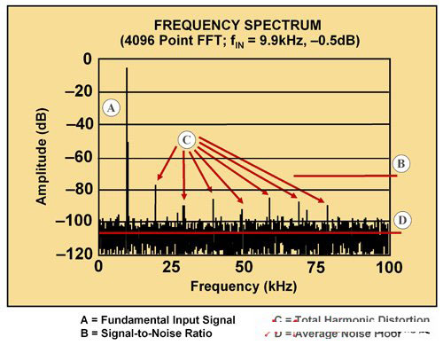 FFT圖中4條規(guī)范包括基本輸入信號(hào)、信噪比、總諧波失真和平均噪聲底限。