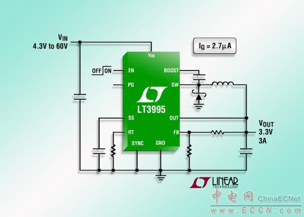 Linear推出靜態(tài)電流只有 2.7µA 的 3A、60V 降壓型開關(guān)穩(wěn)壓器 LT3995。該器件的 4.3V 至 60V輸入電壓范圍使其非常適用于汽車、商用車輛、航空電子和工業(yè)等應(yīng)用。其內(nèi)部的 4.7A 開關(guān)在電壓低至 1.2V時(shí)能提供高達(dá) 3A 的連續(xù)輸出電流。LT3995 的突發(fā)模式 (Burst Mode®) 工作可提供超低的靜態(tài)電流,從而使其非常適用于汽車或工業(yè)系統(tǒng)等應(yīng)用,而這類應(yīng)用要求“始終保持接通”運(yùn)作和最佳的電池工作壽命。