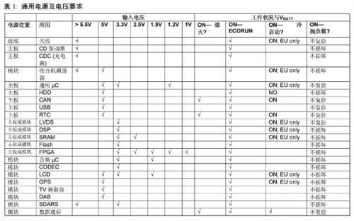 大多數(shù)系統(tǒng)電源的基本架構選擇應從電源要求以及汽車廠商定義的電池電壓瞬變波形入手。對于電流的要求應該反映到電路板的散熱設計。表1歸納了大多數(shù)設計的電路及電壓要求。