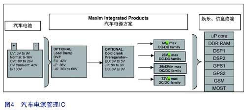 Maxim的汽車電源IC克服了許多電源管理問題,能夠提供獨特的高性能解決方案。電源產(chǎn)品包括過壓保護、微處理器監(jiān)控、開關轉換器和線性穩(wěn)壓器等高 度集成的多功能PMIC (如圖4所示)。電源IC符合汽車級質(zhì)量認證和生產(chǎn)要求,例如:AECQ100認證、DFMEA、不同的溫度等級(包括85℃、105℃、125℃、135℃)、特殊的封裝要求。 |