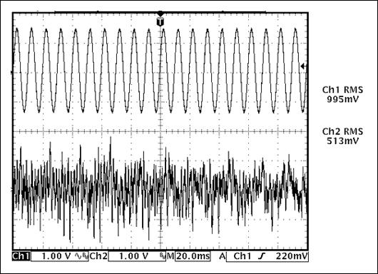 圖1. 正弦波的RMS值高于音頻信號的RMS值,意味著用正弦波測試時,D類放大器的發(fā)熱更大 (點擊放大圖片)