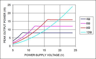 MOSFET輸出級的導(dǎo)通電阻會影響它的效率和峰值電流能力。降低負(fù)載的峰值電流可減少MOSFET的I2R損耗,進(jìn)而提高效率。要降低峰值電流,應(yīng)在保證輸出功率,以及D類放大器的電壓擺幅以及電源電壓的限制的條件下,選擇最大阻抗的揚聲器,如圖5所示。本例中,假設(shè)D類放大器的輸出電流為2A,電源電壓范圍為5V至24V。電源電壓大于等于8V時,4的負(fù)載電流將達(dá)到2A,相應(yīng)的最大連續(xù)輸出功率為8W。如果8W的輸出功率能滿足要求,則可以考慮使用一個12揚聲器和15V供電電壓,此時的峰值電流限制在1.25A,對應(yīng)的最大連續(xù)輸出功率為9.4W。此外,12負(fù)載的工作效率要比4負(fù)載的高出10%到15%,降低了功耗。實際效率的提高根據(jù)不同D類放大器而異。雖然大多數(shù)揚聲器的阻抗都采用4或8,但也可采用其他阻抗的揚聲器實現(xiàn)更高效的散熱。