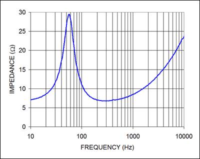圖6. 8阻抗、13cm口徑揚聲器的阻抗隨頻率改變而急劇變化