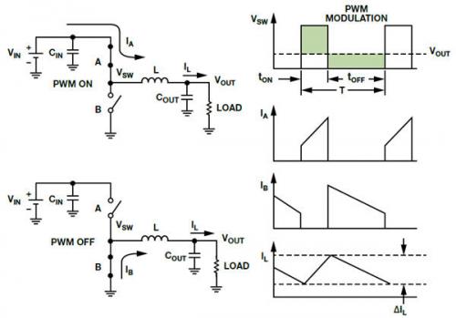 降壓穩(wěn)壓器對輸入電壓進(jìn)行斬波,并通過LC濾波器傳送,以提供穩(wěn)定的輸出,如圖3所示。它使用兩個有源元件和兩個無源元件。有源元件是從輸入到電感的開關(guān)“A”,以及從地面到電感的開關(guān)(或二極管)“B”。無源元件是電感(L)和輸出電容(COUT)它們形成LC濾波器,可以減小由有源元件產(chǎn)生的紋波。