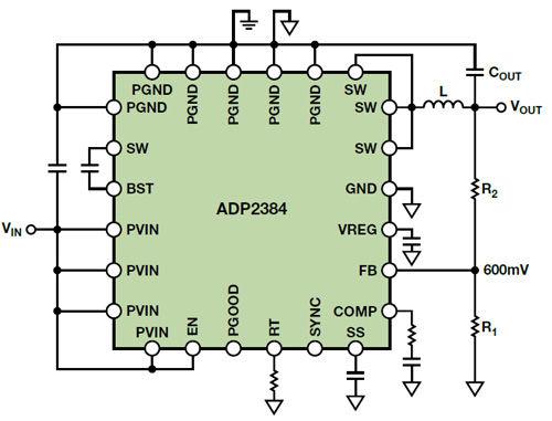ADP2384高效同步降壓穩(wěn)壓器指定最高4 A的輸出電流,具有最高20 V的輸入電壓。圖4顯示了用于調(diào)節(jié)輸出電壓的正常連接。
