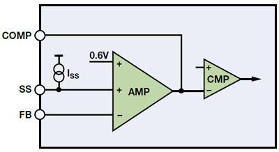 很多通用降壓IC包括軟啟動(SS)或跟蹤(TRK)引腳。SS引腳可緩慢增加啟動時的開關(guān)占空比,從而最大程度地減小啟動瞬變。TRK引腳讓降壓穩(wěn)壓器能夠遵循獨立電壓。這些功能通常結(jié)合到單個SS/TRK引腳上。大多數(shù)情況下,誤差放大器將SS、TRK和FB電壓中的最小值與基準(zhǔn)進(jìn)行比較,如圖6所示。