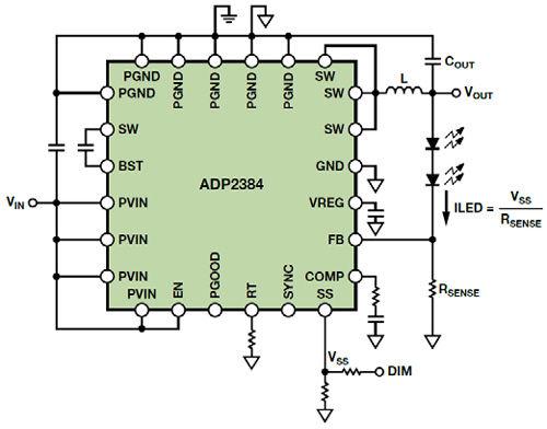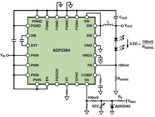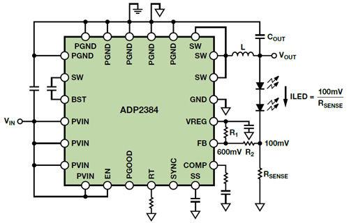 如果開關(guān)是內(nèi)部的,則降壓器稱為穩(wěn)壓器,如果開關(guān)是外部的,則稱為控制器。如果兩個開關(guān)都是晶體管(MOSFET或BJT),則它是同步的,如果底部的開關(guān)是使用二極管實施的,則它是異步的。這些類型的降壓電路各有優(yōu)劣,但同步降壓穩(wěn)壓器通?梢詢(yōu)化效率、器件數(shù)量、解決方案成本和電路板面積。遺憾的是,用于驅(qū)動高電流LED(高達(dá)4A)的同步降壓穩(wěn)壓器很少,而且成本昂貴。本文以ADP2384為例,展示如何修改標(biāo)準(zhǔn)同步降壓穩(wěn)壓器的連接以調(diào)節(jié)LED電流。