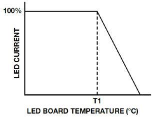 由于LED的使用壽命在很大程度上取決于其工作結(jié)溫,有時必須監(jiān)控LED溫度,如果溫度過高,必須做出響應(yīng)。導(dǎo)致異常高溫的原因可能是散熱器連接不當(dāng)、周邊溫度過熱或其他一些極端條件。常見解決方案是在當(dāng)溫度超過某個閾值時減小LED電流(圖13)。這稱為LED 熱折返。