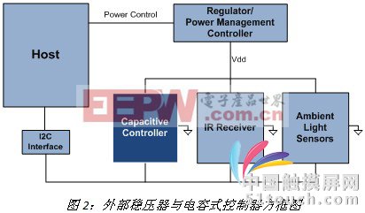在這些應用中,主機控制器負責控制一個外部穩(wěn)壓器或電源管理集成電路(PMIC),通過外部穩(wěn)壓器或PMIC來控制和調整電容式控制器及其他設備的電源。下圖2給出了典型的實施方框圖!