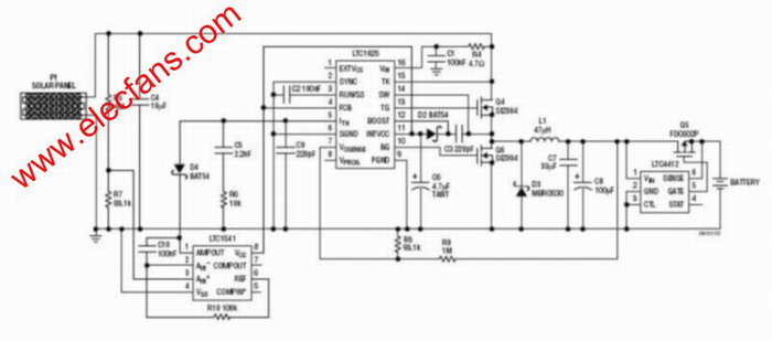 圖1中的電路被置于太陽能電池板和電池之間,用于調(diào)節(jié)電池浮動電壓。基于LTC1541的附加控制環(huán)路強制充電器在最大電池板功率點上運作。這種效率的提升縮減了所需的電池板尺寸,因而降低了總體解決方案的成本。當(dāng)電池板峰值電源電壓和電池電壓之間存在失配時,這款電路的重要優(yōu)點表現(xiàn)得尤為突出。 |