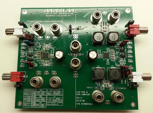 圖1. 整個(gè)項(xiàng)目從MAX98400A開始。評(píng)估板上有兩個(gè)40W放大器,我計(jì)劃設(shè)計(jì)的音箱聲音會(huì)很響亮。