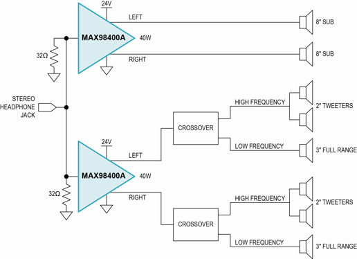 圖2. 在手提音箱中采用兩個(gè)MAX98400A放大器的揚(yáng)聲器元件原理圖。一個(gè)放大器專用于推動(dòng)大8in揚(yáng)聲器,另一個(gè)放大器通過(guò)交叉點(diǎn)開關(guān)推動(dòng)兩個(gè)2in高音揚(yáng)聲器和一個(gè)3in全頻揚(yáng)聲器。