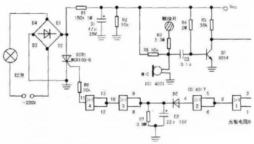 下圖是聲、光、觸摸三控延時自熄開關的電氣原理圖,該電路由電源電路、信號檢測轉(zhuǎn)換電路、延時電路和控制電路組成。