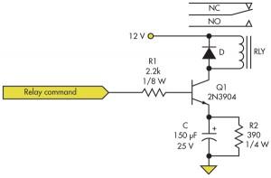 繼電器驅(qū)動晶體管的發(fā)射級接地,我們加上的電阻和電容打斷它。當(dāng)驅(qū)動晶體管是關(guān)斷時,R2保證電容放電,當(dāng)繼電器打開驅(qū)動晶體管時,電容相當(dāng)于一個短路,使最大電流通過繼電器線圈,并保持閉合。