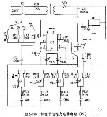 該鋅錳干電池充電器電路由電源輸入穩(wěn)壓電路、充電電路和定時(shí)控制電路組成,如圖5-124所示。