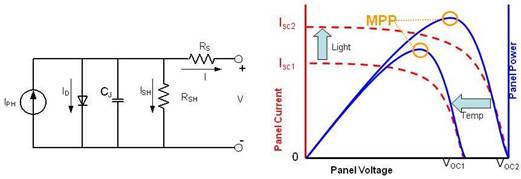 當(dāng)光線照在太陽能電池上時(shí),電池產(chǎn)生一個(gè)流過輸出端的電流 IPH。電池為開路時(shí),該電流在輸出端形成電壓 VOC。在開路和短路兩種極端情況之間,電池產(chǎn)生功率。圖 1 中,紅色曲線表示太陽能電池的電流對(duì)比電壓特性。照度增加,短路電流增加,并對(duì)電池開路電壓產(chǎn)生微弱影響。從太陽能電池獲得的功率在某個(gè)特定的電壓下達(dá)到最大,然后在該電壓任意一端逐漸下降。這就是電池的最大功率點(diǎn)。它與入射光及其他環(huán)境因素有關(guān),例如:溫度等。由于其高阻抗特性,其他轉(zhuǎn)換器都具有類似的最大功率點(diǎn) (MPP) 特性。因此,如何選擇一種電源管理解決方案,讓其能夠工作在 MPP 下,是我們需要考慮一個(gè)的關(guān)鍵因素。