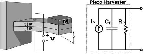 采集環(huán)境機(jī)械能的一種普遍方法是利用壓電組件。圖 3 所示壓電材料承受的輸入振動(dòng),在器件中引起機(jī)械應(yīng)變,之后轉(zhuǎn)換為電荷。PE采集器的等效電路可以表示為一個(gè)機(jī)械彈簧質(zhì)量系統(tǒng),其與一個(gè)電氣域聯(lián)接。仔細(xì)觀察器件的諧振頻率,我們可以將整個(gè)電路變換為電氣域[2]。這樣,當(dāng)受到正弦振動(dòng)激勵(lì)時(shí),便可將壓電組件建模為一個(gè)正弦電流源,其與電容 CP 和電阻 RP 并聯(lián)。