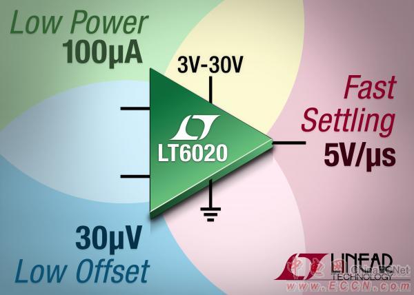 Linear推出 3V 至 30V 快速穩(wěn)定雙路運算放大器 LT6020,該器件具備 30µV 最高輸入失調電壓和 0.5µV/°C 最大 VOS 漂移。雖然每個放大器的電源電流只有 100µA (最大值),但專有的擺率增強電路可提供快速干凈的輸出階躍響應。不管輸出階躍是 5V 還是 25V,LT6020 都能在不到 15µs 的時間里穩(wěn)定至 0.0015%。特別設計的輸入電路維持了高阻抗,從而最大限度地抑制了由于快速階躍而引起的電壓尖峰 (針對高達 5V 的輸入階躍)。所有這些特性使得 LT6020 非常適合于高精度多路復用數(shù)據(jù)采集系統(tǒng)、DAC 緩沖器應用和便攜式高精密儀器。