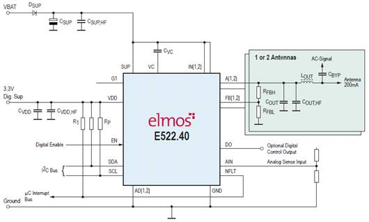 德國(guó)多特蒙德,艾爾默斯公司(elmos)日前宣布推出一種緊湊型封裝的汽車級(jí)雙天線電源保護(hù)芯片。該芯片為天線系統(tǒng)提供靜電保護(hù)(ESD保護(hù))以及電源對(duì)地/電池的短路保護(hù),同時(shí)該芯片具備過(guò)熱保護(hù)的功能。通過(guò)I2C總線接口,可以非常方便的通過(guò)兩根數(shù)據(jù)線對(duì)多個(gè)不同的器件進(jìn)行尋址。該芯片采用QFN20L5封裝。
