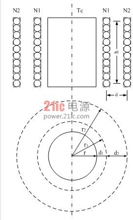 在圖2-30中,N1、N2分別為變壓器的初、次級線圈,Tc是變壓器鐵芯。r是變壓器鐵芯的半徑,r1、r2分別是變壓器初、次級線圈的半徑;d1為初級線圈到鐵芯的距離,d2為初、次級線圈之間的距離。為了分析計算簡單,這里假設(shè)變壓器初、次級線圈的匝數(shù)以及線徑相等,流過線圈的電流全部集中在線徑的中心;因此,它們之間的距離全部是兩線圈之間的中心距離,如虛線所示。