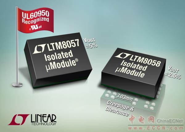 Linear推出 1.5W 輸出 µModule® ( 微型模塊) DC/DC 轉(zhuǎn)換器 LTM8057 和 LTM8058,這兩款器件提供 2kV AC 電氣隔離 (生產(chǎn)測(cè)試至 3kV DC),采用 9mm x 11.25mm x 4.92mm BGA (球珊陣列) 封裝。LTM8057 和 LTM8058 含有一個(gè)隔離式變壓器、控制電路、功率開(kāi)關(guān)和容量適度的輸入及輸出電容。這兩款 µModule 轉(zhuǎn)換器是經(jīng)過(guò) UL60950 認(rèn)證的組件,符合 #464570 文件要求。兩款器件都在 3.1V 至 31V 的輸入電壓范圍內(nèi)工作,在副邊提供穩(wěn)定的輸出電壓,電壓可調(diào)在 2.5V 至 12V (LTM8057) 和 1.2V 至 12V (LTM8058) 范圍。LTM8058 含有一個(gè)低噪聲線性后置穩(wěn)壓器,在 300mA 時(shí)將輸出紋波降至 20µVRMS。在等級(jí) 2 污染環(huán)境*中,爬電距離和電氣間隙支持高達(dá) 250V 工作電壓,以在測(cè)試儀器、服務(wù)器、工業(yè)自動(dòng)化、控制以及伺服系統(tǒng)中斷開(kāi)接地環(huán)路。