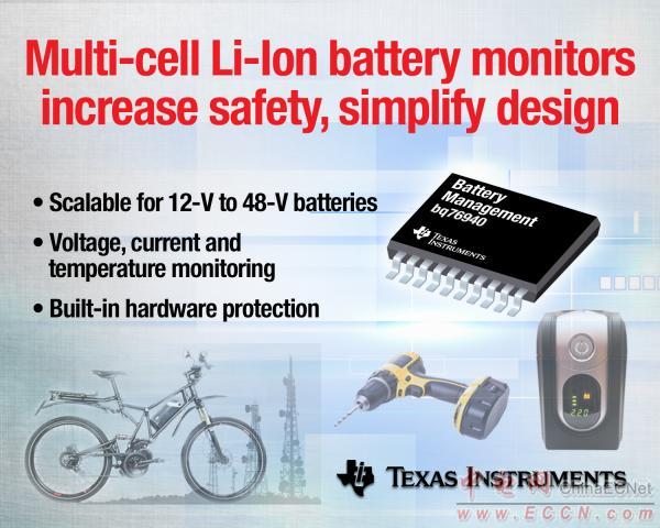 TI宣布推出首批可擴(kuò)展多節(jié)電池監(jiān)控器,其不僅可大幅提升電池組安全性,而且還可縮短 12V 至 48V 鋰離子電池及磷酸鐵鋰離子電池的設(shè)計(jì)時(shí)間——這些電池能夠充分滿足電動(dòng)自行車、電動(dòng)工具以及能源存儲(chǔ)系統(tǒng)的應(yīng)用需求。最新 bq76920、bq76930 與 bq76940 電路可在惡劣充電或工作環(huán)境下有效保護(hù)和控制 3 至 15 節(jié)電池。
