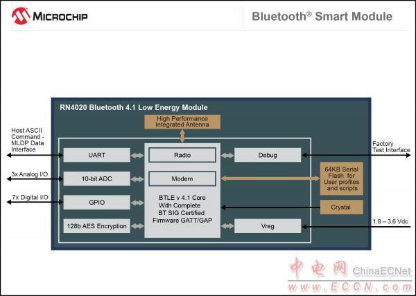 Microchip推出公司首款藍(lán)牙® 4.1低功耗模塊。RN4020基于Microchip在傳統(tǒng)藍(lán)牙技術(shù)方面積累的深厚經(jīng)驗(yàn)研發(fā)而成,新模塊通過了全球法規(guī)認(rèn)證以及藍(lán)牙技術(shù)聯(lián)盟(SIG)的認(rèn)證。集成的藍(lán)牙低功耗(BTLE)協(xié)議棧以及對通用SIG低功耗配置文件的板載支持既加速了產(chǎn)品的上市時(shí)間,也確保了藍(lán)牙技術(shù)的兼容性,在免除高昂認(rèn)證費(fèi)用的同時(shí)還降低了開發(fā)風(fēng)險(xiǎn)。此外,該模塊預(yù)裝了Microchip低功耗數(shù)據(jù)配置文件(MLDP),使設(shè)計(jì)人員可以輕松通過BTLE鏈接傳送任意類型的數(shù)據(jù)流。