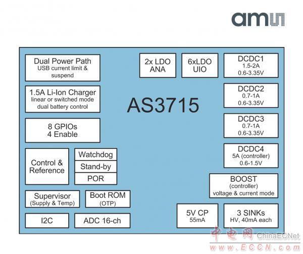 新的AS3715包含所有鋰電池驅(qū)動手持設備電源解決方案所必不可少的電源管理構(gòu)件,包括運動攝影相機、導航設備、平板電腦、媒體播放器以及游戲操縱桿等。
