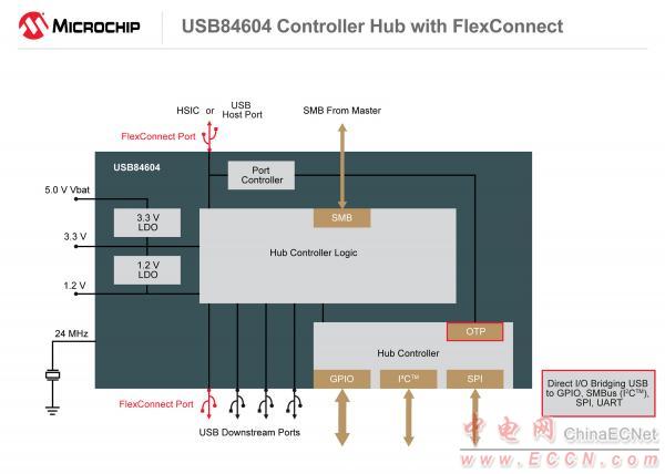 USB84604可以從外部閃存載入其功能和配置。片上一次性編程(OTP)存儲器可用來裝載永久配置,而系統(tǒng)管理總線(SMBus)從接口可用來定制USB84604的功能。此接口能夠控制數(shù)字線和USB線進(jìn)行內(nèi)部測試,配置集線器使其在枚舉時選定理想功能,還可以裝載定制固件充分實(shí)現(xiàn)全新UCH2的特性。