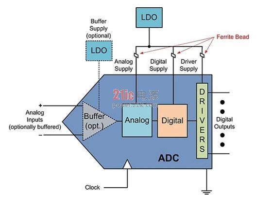 采用單個LDO驅(qū)動多個ADC電源輸入