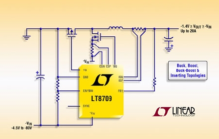 Linear推出適用于負(fù)至負(fù)或負(fù)至正 DC/DC 轉(zhuǎn)換的同步 PWM 控制器 LT8709。該器件無需復(fù)雜的電平轉(zhuǎn)換電路,就能夠獨(dú)特地解決相對于系統(tǒng)地的負(fù)電壓的調(diào)節(jié)問題。LT8709 的同步工作意味著,一個(gè)高效率 P 溝道 MOSFET 取代了輸出二極管,因此提高了效率,允許更大的輸出電流 (高達(dá) 20A),而且無需中到大功率應(yīng)用通常所需的散熱器。LT8709 可配置為降壓、升壓、降壓-升壓和負(fù)輸出拓?fù),從而使該器件高度通用以適用于多種電源設(shè)計(jì)。