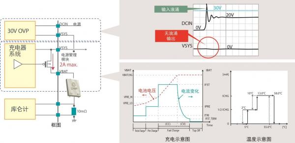 另外,當不選擇電池供電,而選擇外部供電裝置供電時,有時會出現(xiàn)意外的浪涌電壓。作為其對策,本產品內置過電壓保護電路,可抗30V以內的浪涌電壓,保護元器件不受損壞。此外,可輕松保護連接VSYS端子的各種設備(IC),將實現(xiàn)安全的電源系統(tǒng)。