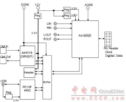 AKM公司的AK4558是低電壓32位216kHz數(shù)字音頻系統(tǒng)編譯碼器(CODEC),支持各種信號(hào),具有較好的帶外噪音和低功耗,主要用在高檔音響設(shè)備和電子樂(lè)器以及音頻接口.本文介紹了AK4558主要特性和框圖,系統(tǒng)連接框圖以及評(píng)估板AKD4558-A功能,框圖,電路圖和PCB元件布局圖.
