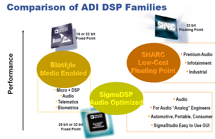 實(shí)際上,ADI針對音頻市場的不同要求,有著清晰的產(chǎn)品劃分。用在高端的是SHARC® DSP,用在中高端的是Blackfin® DSP家族,用在主流產(chǎn)品的是ADAU145x系列,入門級(jí)則由ADAU17xx擔(dān)當(dāng)。