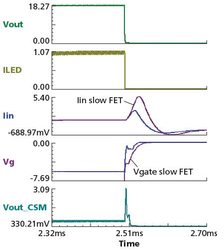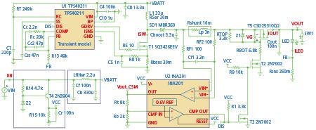 此電路展示并模仿了中斷情景,也在多變的負(fù)載條件下限制升壓轉(zhuǎn)換器LED驅(qū)動器的輸入/輸出電流。該電路經(jīng)過優(yōu)化可以適合于汽車LED前燈驅(qū)動器應(yīng)用。我們證明了實現(xiàn)最優(yōu)電路響應(yīng)時間需要仔細的分析和組件選擇。將這些靈敏性集成到一個綜合性時域電路模擬中有助于理解不同工作條件和組件選擇情況下的電路運行狀態(tài)。