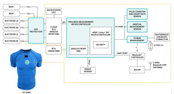 Wearable electronics have the potential to improve lifestyles, from the active fitness enthusiast to those with chronic illnesses who need round-the-clock vital signs monitoring. The latest Fit Shirt demonstrates our wellness platform of products designed specifically for wearable electronics. Sensors built into the shirt gather data on heart rate, oxygen saturation, ECG, motion, respiration and body temperature. The on- board microcontroller delivers results to a tablet via Bluetooth, and advanced power management allows the battery to run for weeks at a time.