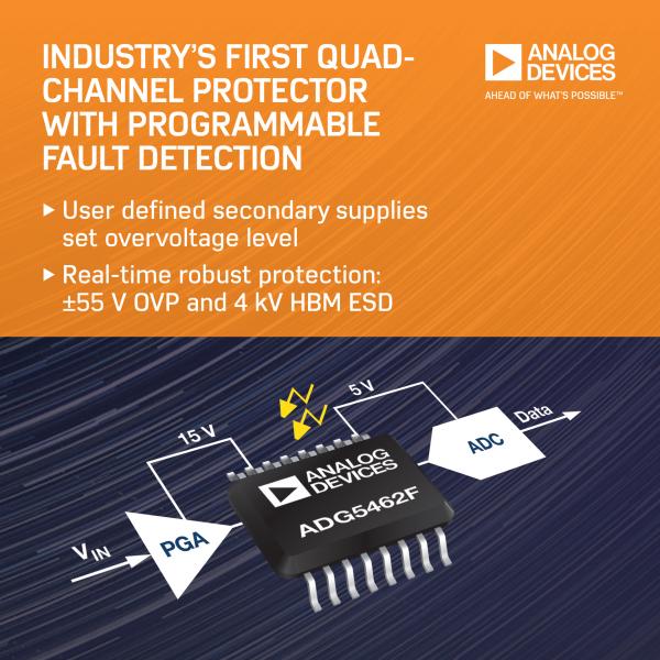 ADI全球領先的高性能信號處理解決方案供應商,最近推出一款四通道保護器ADG5462F和兩款多路復用器ADG5248F、ADG5249F,其可提供+/-55-V過壓保護(OVP),適用于采用4.5V低壓至36V電壓的精密轉(zhuǎn)換器、放大器和其他器件。四通道保護器ADG5462F、8:1多路復用器ADG5248F和差分4:1多路復用器ADG5249F具有+/-55-V過壓引腳上電和關斷級,可針對熱插拔和操作人員誤用事件提供魯棒的精密保護,從而保障下游模擬器件的安全。利用片內(nèi)故障診斷,新器件成為業(yè)界首個能夠檢測并避免缺陷通道的產(chǎn)品,有利于簡化故障檢測算法并提升系統(tǒng)正常運行時間。新產(chǎn)品允許用戶定義與主電源無關的故障觸發(fā)電平,最大程度地提高了設計靈活性。另外,由于不再需要多個分立保護器件,ADG5462F、ADG5248F和ADG5249F使PCB面積得到優(yōu)化,并且設計過程得以簡化。這些器件針對精密儀器儀表、過程控制和航空電子應用進行了優(yōu)化。